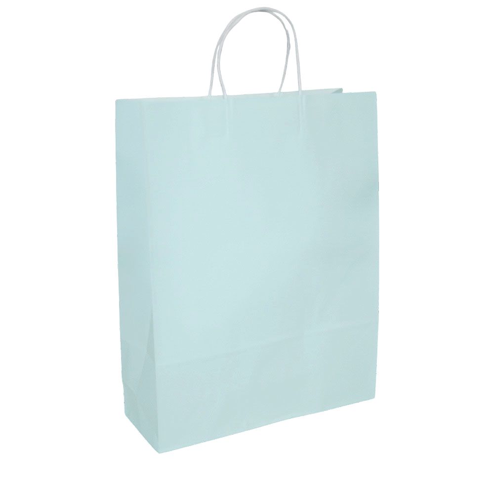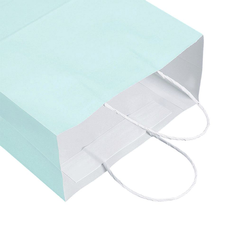 Подарочный пакет из крафтовой бумаги пастельного оттенка с белыми бумажными ручками и белой внутренней стороной.