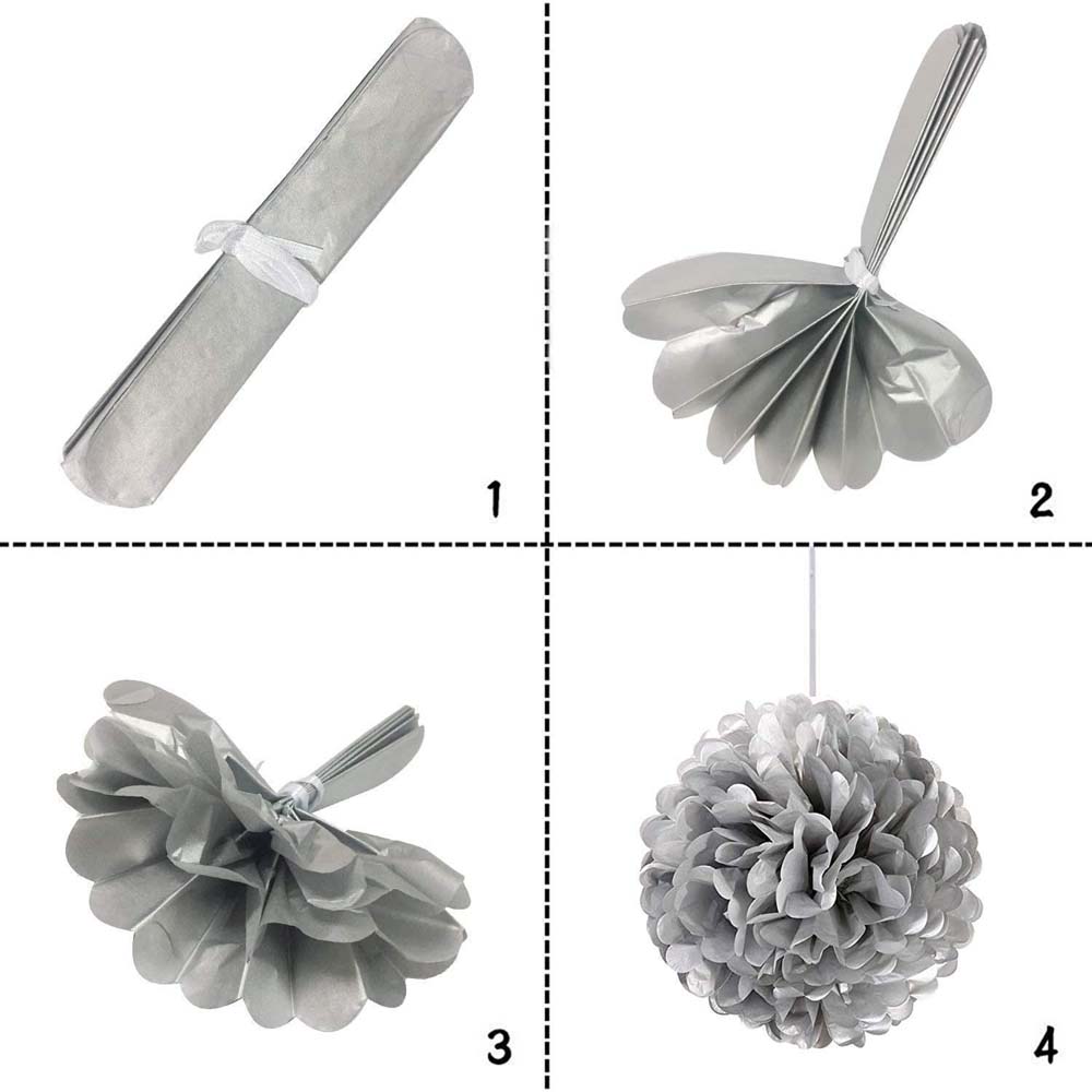 Серебряный бумажный помпон диаметром 25 см — стильное и лёгкое украшение для праздников, фотозон, витрин и интерьера. Отлично подойдёт для дней рождений, свадеб, вечеринок и тематических мероприятий.